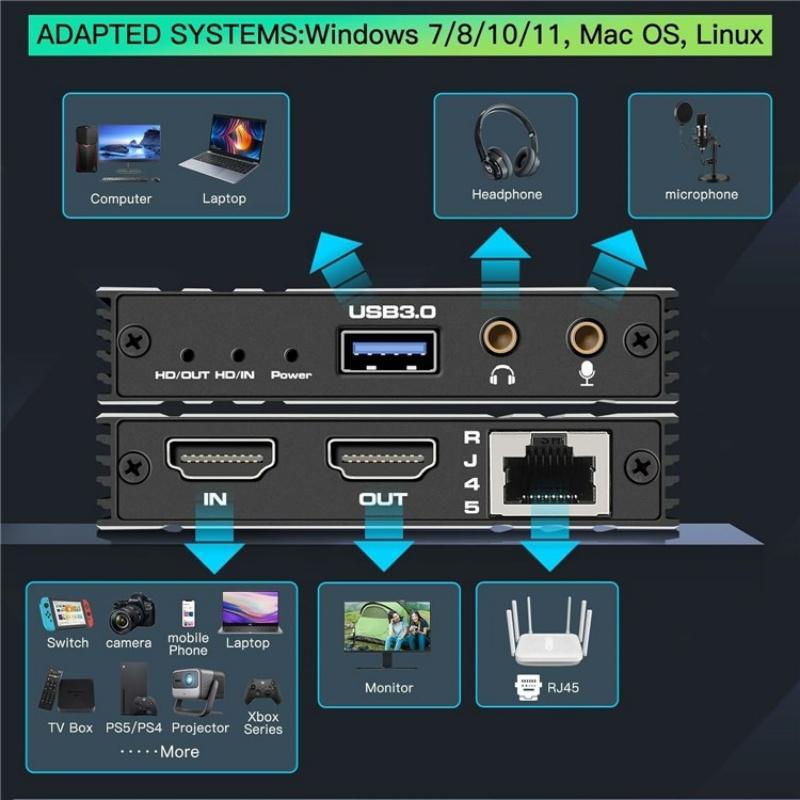 1.4K HDMI USB 3.0 Video Capture Card:Supports 4K@60Hz HDMI pass-through and captures up to 1080P@60FPS, 2560x1440@50FPS, or 3840x2160@18FPS via USB 3.0 output.