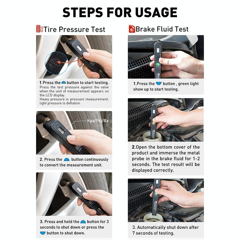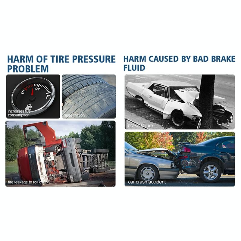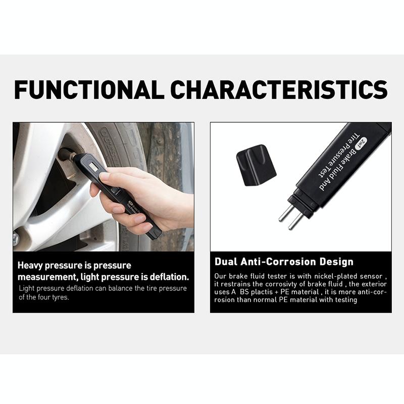 2. The tester is a new high-tech product that combines automotive brake fluid testing and tire pressure testing. Users can regularly check the water content of the brake fluid of the car, making driving safer and more worry-free Using the right tire pressure can give you greater safery, longer tire life and better fuel consumption, and hope it will protect your safe driving.