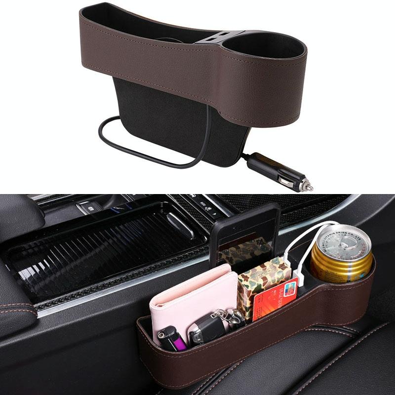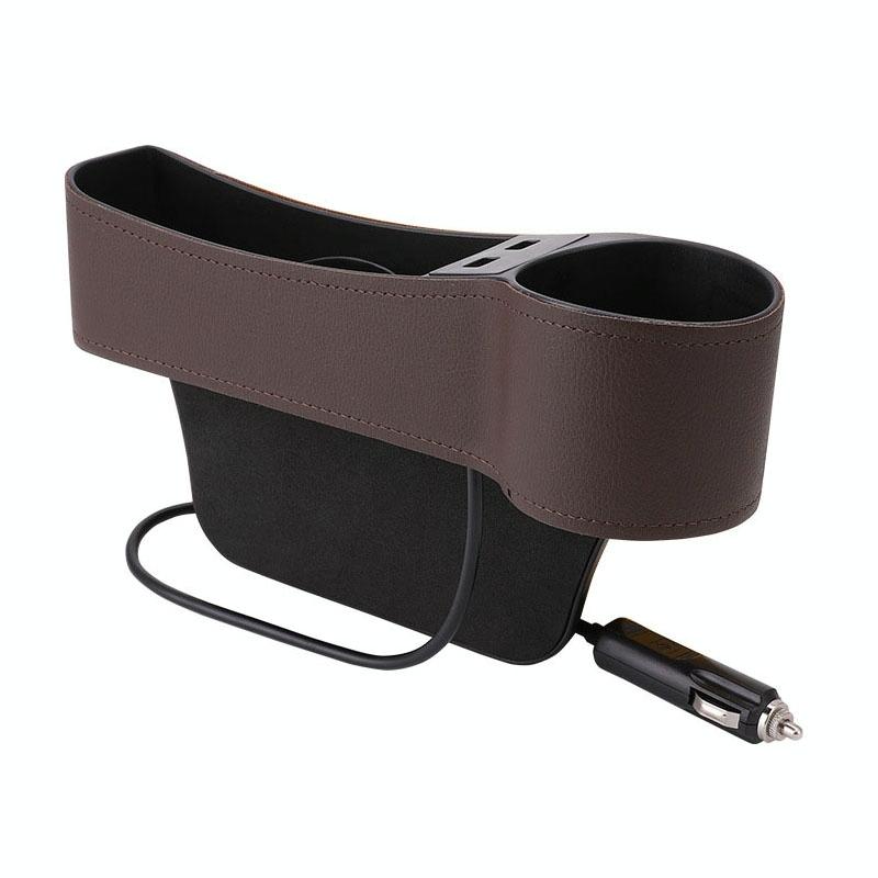 Car Multi-functional Co-pilot Seat Console PU Leather Box Cigarette Lighter Charging Pocket Cup Holder Seat Gap Side Storage Box(Coffee)