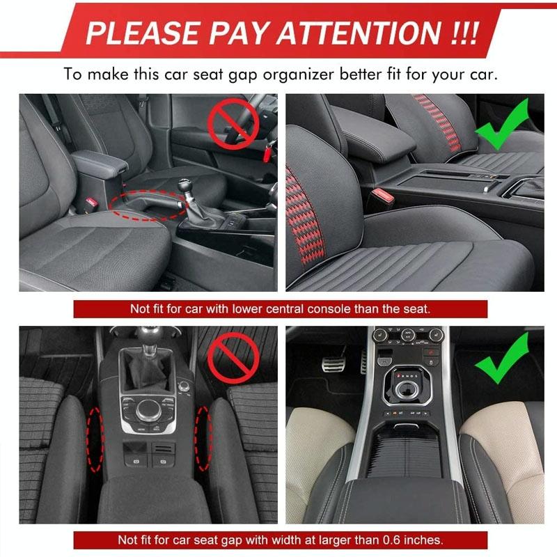2. This car seat gap filler box is not suitable for cars with a lower center console than the seat, and is not suitable for car seat gap with width at larger than 0.6 inch.