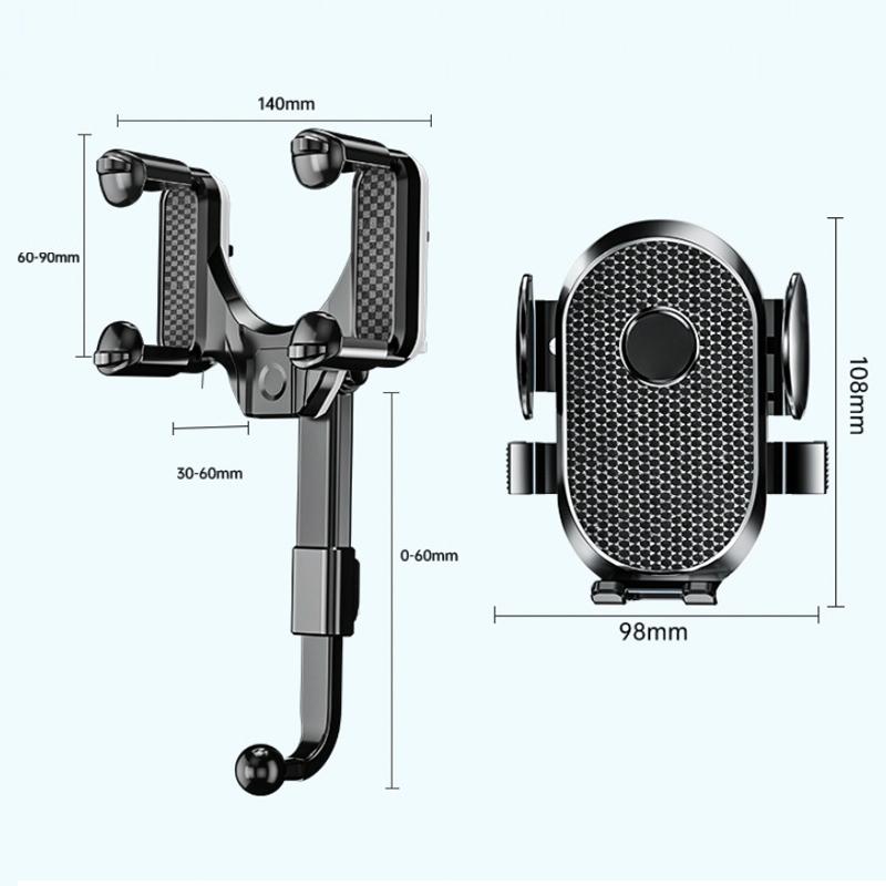 10. Size: mobile phone clamping panel 98x108mm, rearview mirror clamping height 60-90mm, rearview mirror clamping thickness 30-60mm, extendable 0-60mm