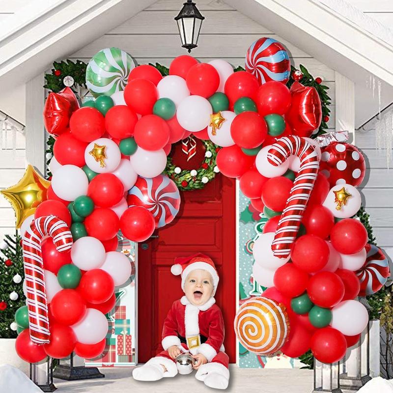 10. Balloon chain 2 specifications: 10 inch red balloon x 60+10 inch white balloon x 60+5 inch dark green balloon x 10+18 inch dark green balloon x 2+mini christmas gift x 2+mini walking stick x 2+large walking stick x 2+mini christmas black hat snowman x 1+18 inch lollipop balloon x 2+18 inch christmas wreath x 1+christmas elk x 1+gift box x 2+balloon chain x 1+ribbon x 1+dispensing x 1+ straw x 1