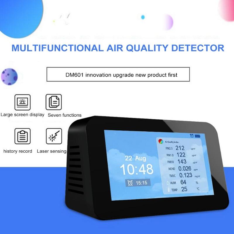 11. Multifunctional air quality detector, which can detect formaldehyde (HCHO), total volatile organic compounds (TVOC), particles less than 2.5 microns in size (PM2.5/1.0/10), temperature and humidity, with clock and record Features