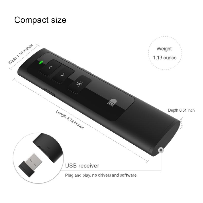 1. Rechargeable wireless presenter. It features ergonomic buttons for comfortable operation. Design with a compact size, easy to use and carry everywhere. Support PowerPoint, Keynote and Prezi.