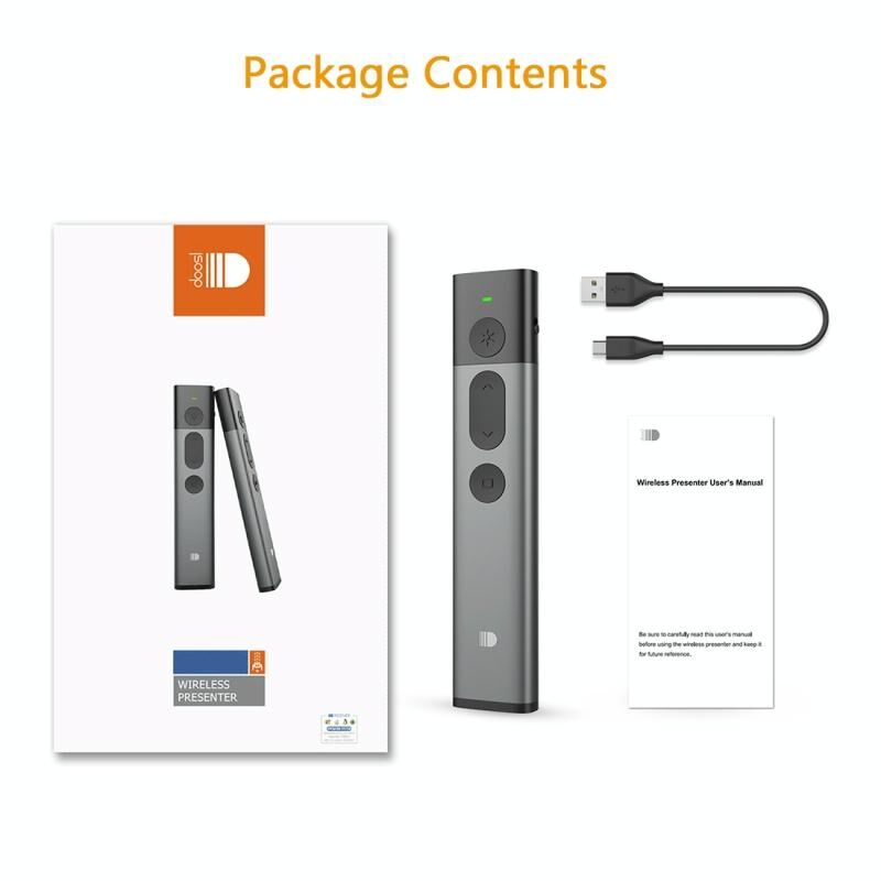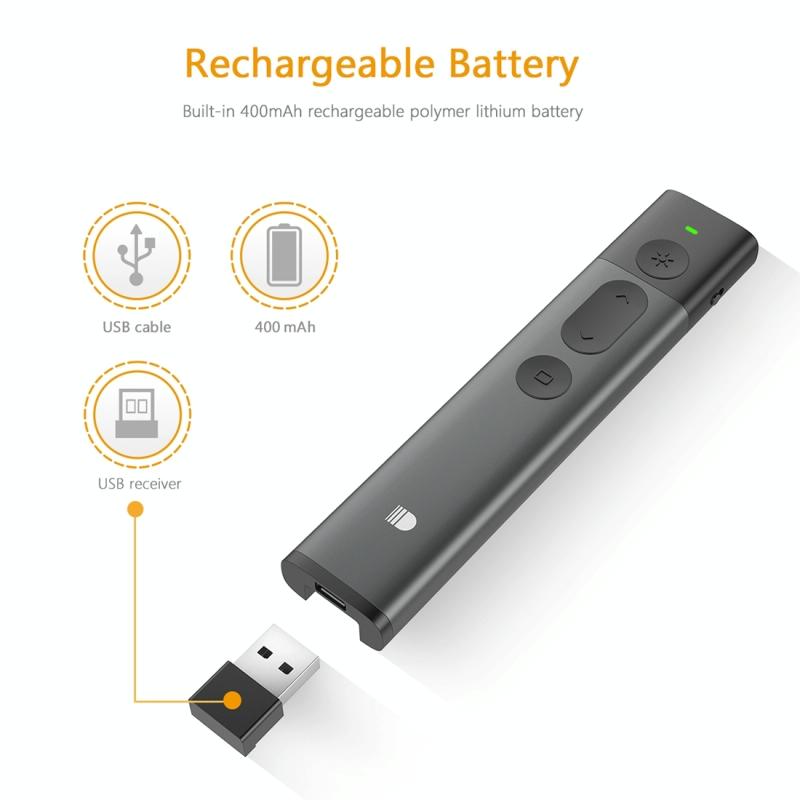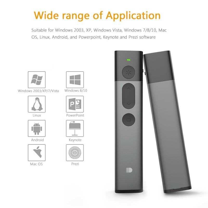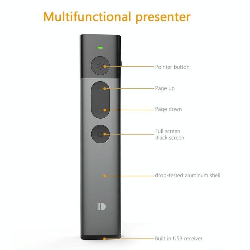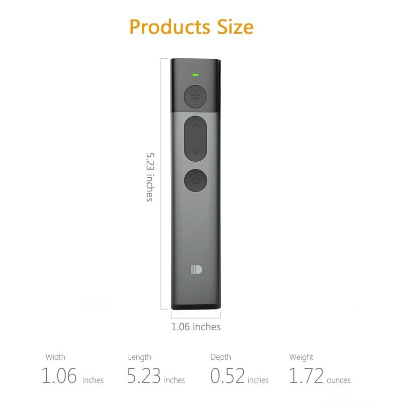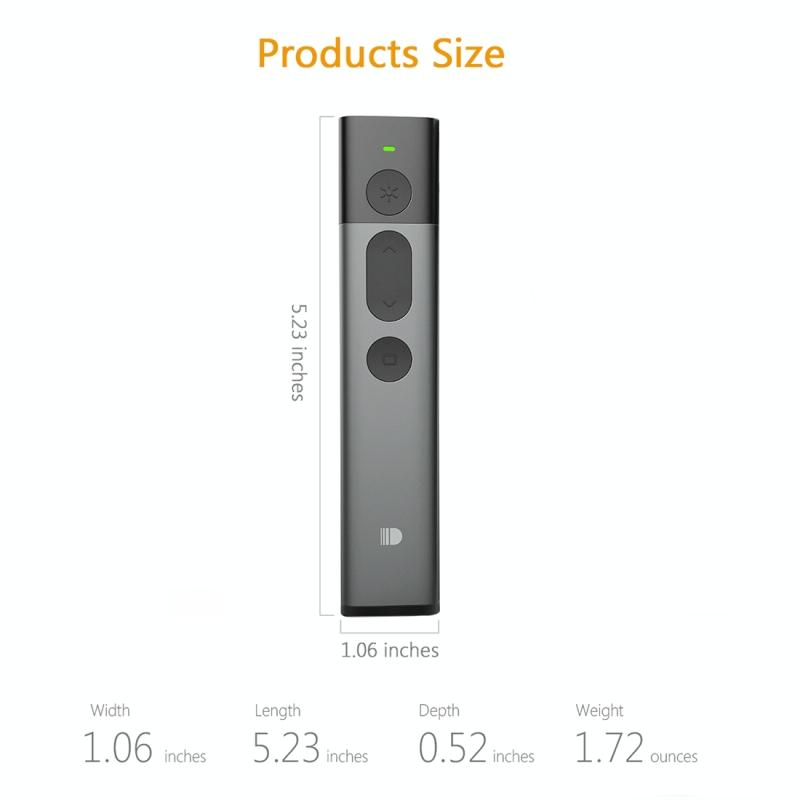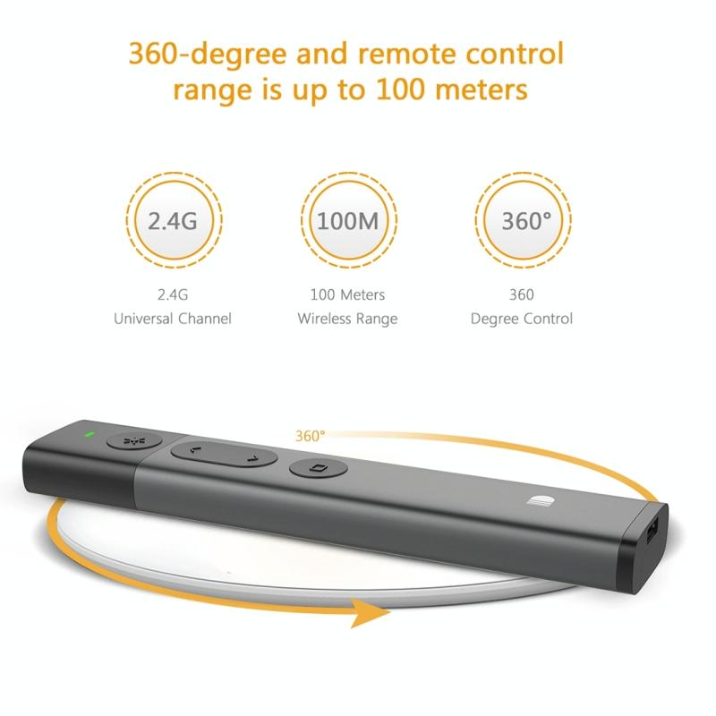4. Wireless presenter, it is equipped with top-grade microchip, up to 100 meters wireless range. Operating on 2.4G RF frequency, it is an ISM free frequency and can be used world-wide.