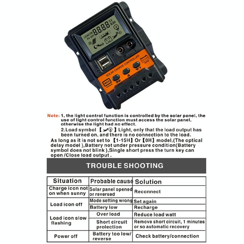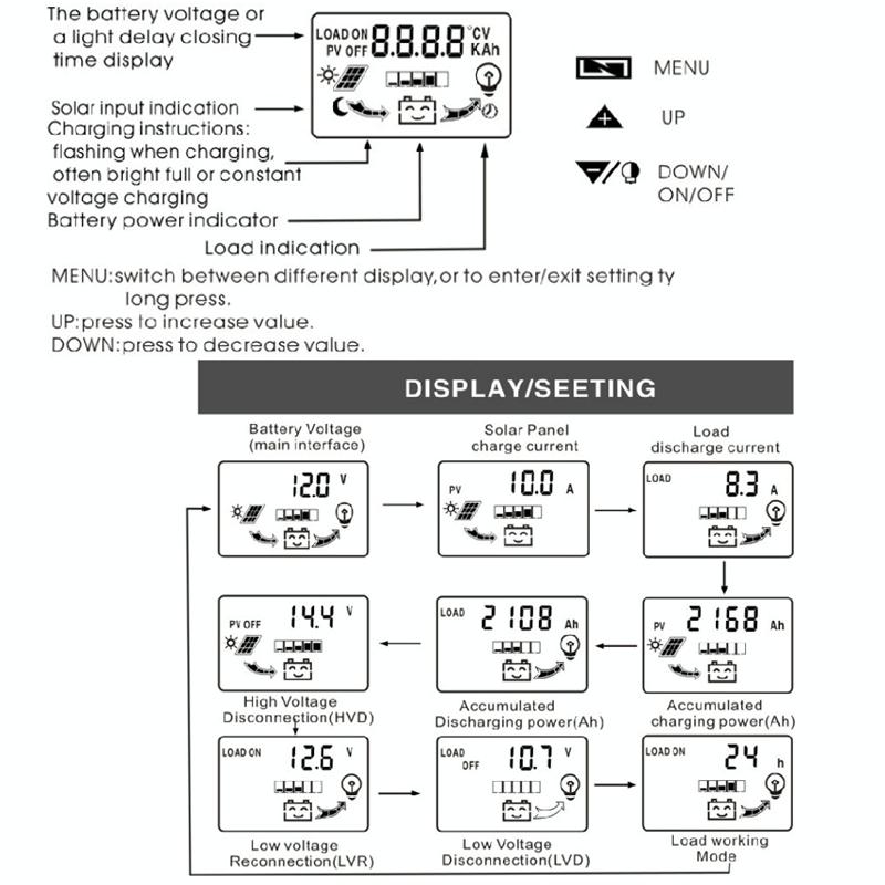 2. Large-screen LCD display; charging and discharging current display; cumulative power generation and discharge power query; temperature display; light control + delay control; adjustable charging and discharging parameters; with power-off memory and other functions