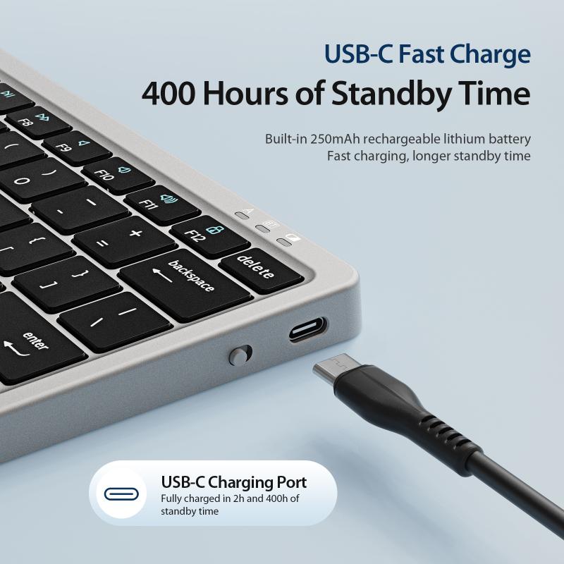 5. Built-in 250mAh rechargeable lithium battery, using USB-C fast charging can fully charge the keyboard in 2 hours, after it is fully charged, it can work continuously for 31 hours, if not working at all, the standby time is 400 hours.