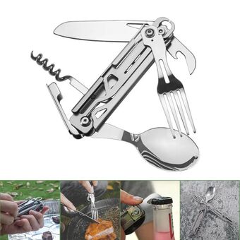 6-in-1 Folding Tableware (Fork/Knife/Spoon/Bottle Opener) for Camping and Survival(Silver)