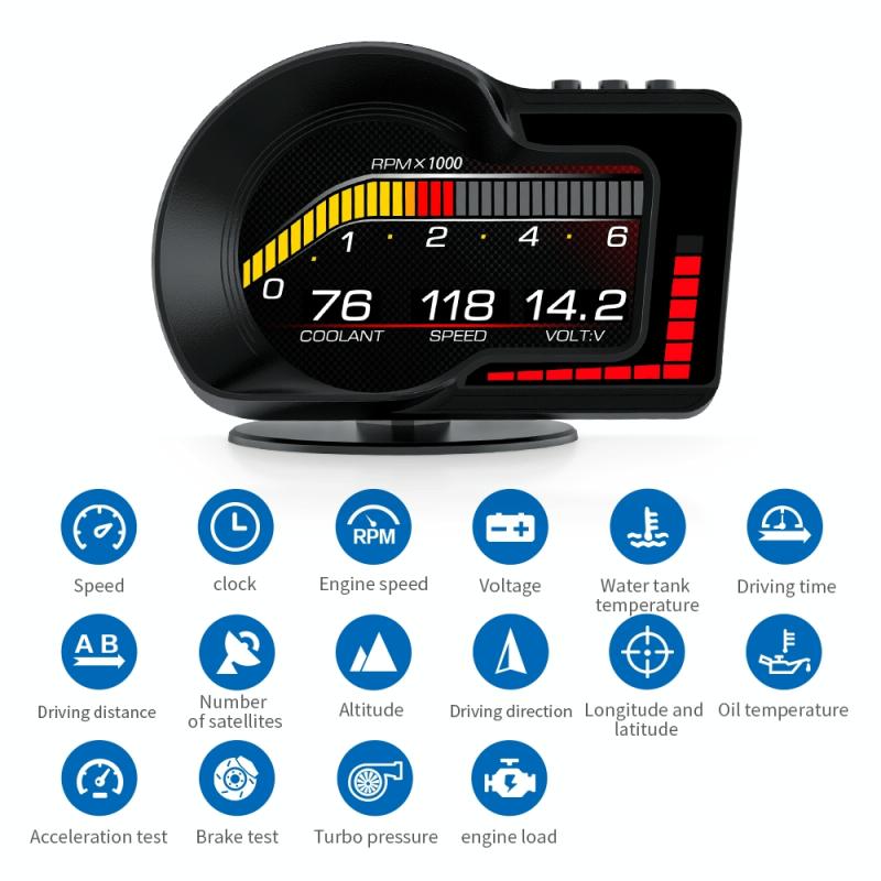 5. OBD mode display information: vehicle speed, time, rotation speed, water temperature, voltage, driving time, driving distance, number of satellites, driving direction, latitude and longitude display, oil temperature, turbo pressure, acceleration test, brake test, altitude