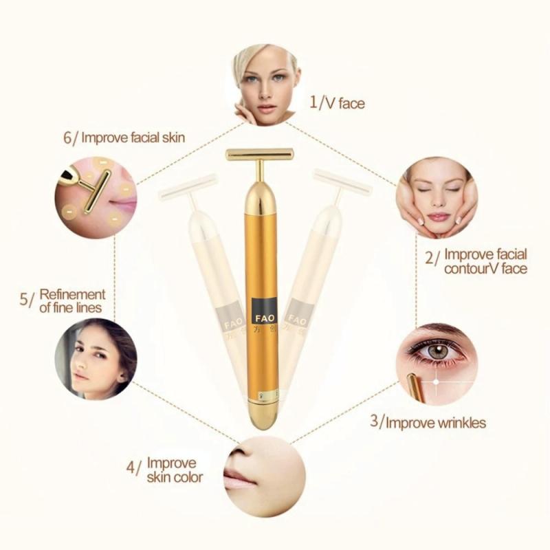 2. First clean the face, after can apply lotion or cream, take out beauty bar, electric massage stick handle bottom rotary switch open (i.e., turned to the ON state) beneath the hand holding the electric massager, two-thirds of the position will be electric massager T parts ON the face began to massage.