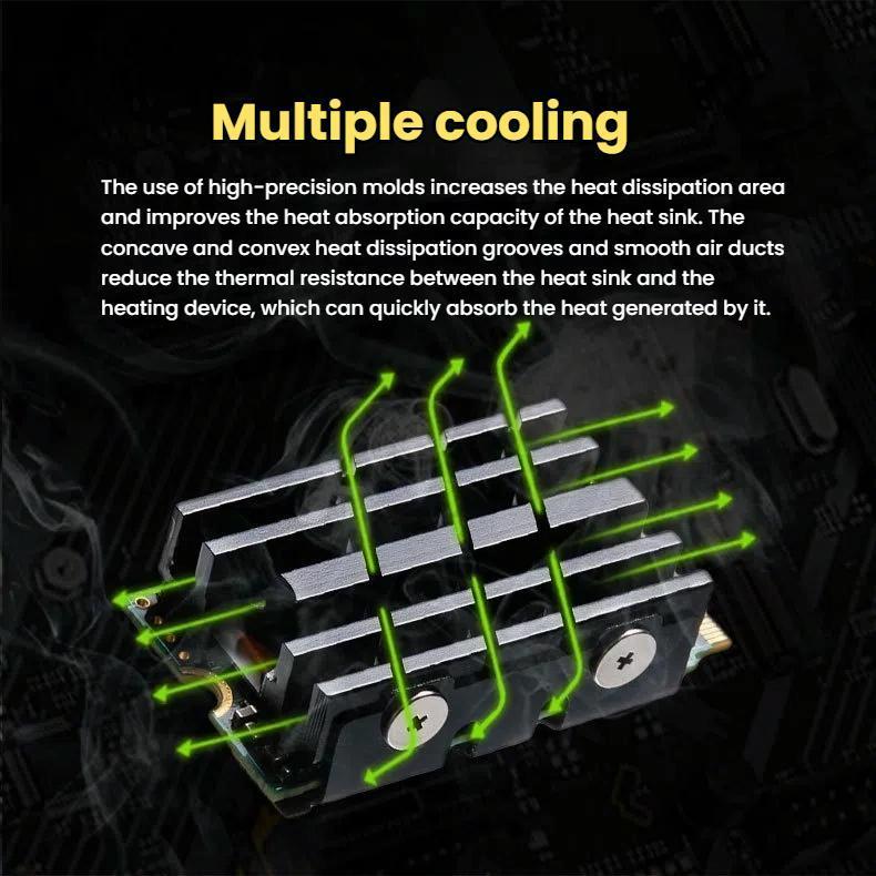 3. The CNC-finished all-aluminum alloy heat sink is equipped with high-efficiency phase-change thermal conductive silicon wafers, which dissipate heat on both sides and effectively suppress the temperature rise of the solid state drive and reduce the performance of the SSD.
