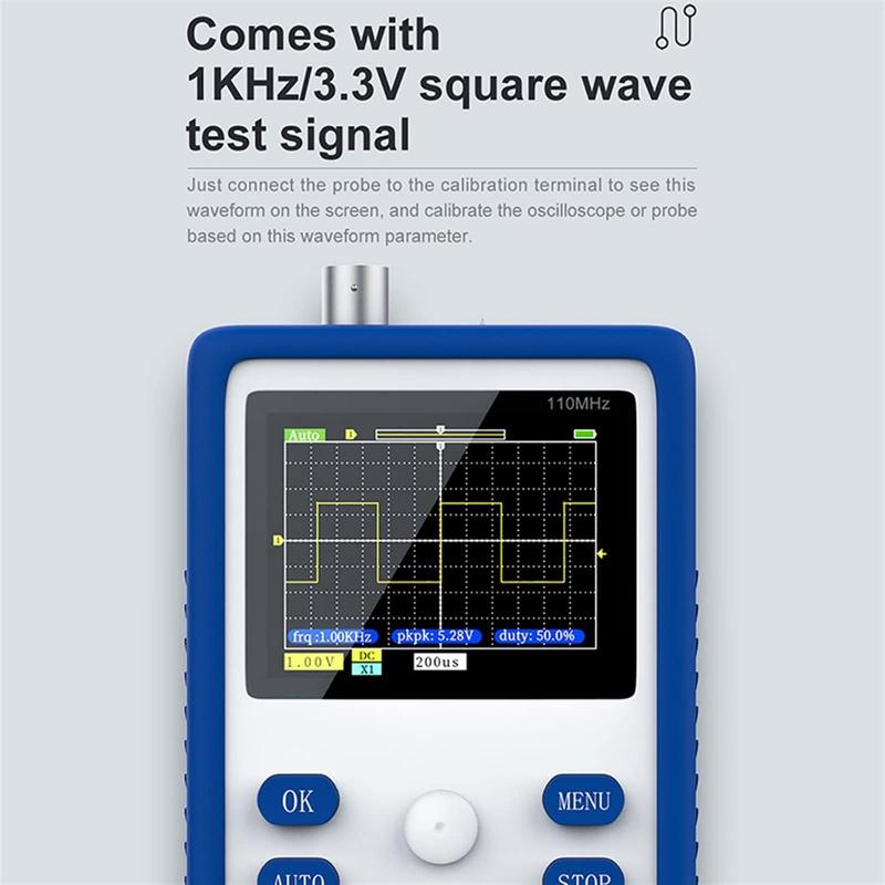 4. 1KHz/3.3V square wave test signal, just connect the probe to the calibration end to see the waveform on the screen