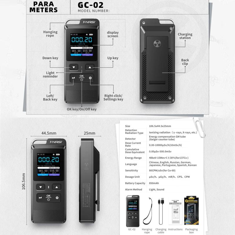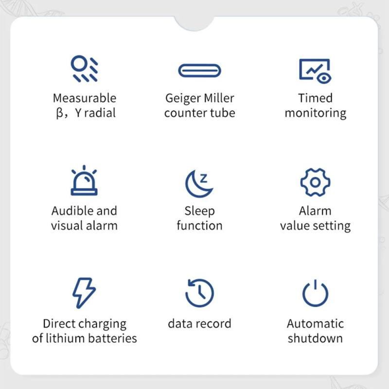 1. Energy-Compensated GM Tube: Accurately detects ionizing radiation (gamma, X-ray, beta) in the energy range of 48?keV to 15?MeV, with a sensitivity of 80 CPM/microsievert (Co-60).