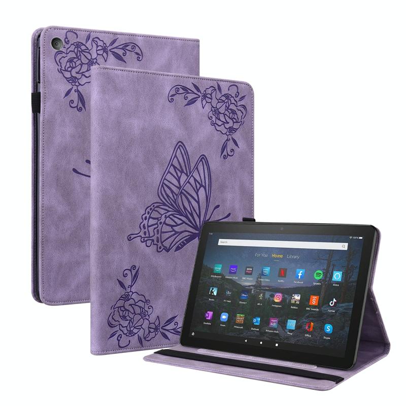 For Amazon Kindle Fire HD 8 2018/2017/2016/2015 Butterfly Flower Embossed Leather Tablet Case(Purple)