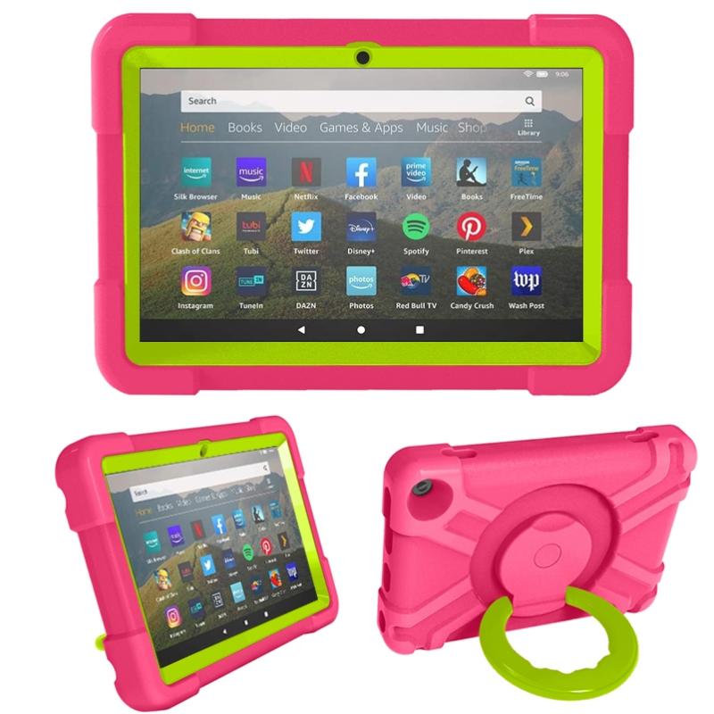 For Amazon Kindle Fire HD8 (2020) PC + Silicone Shockproof Combination Case with 360 Degree Rotating Holder & Handle(Rose Red + Grass Green)