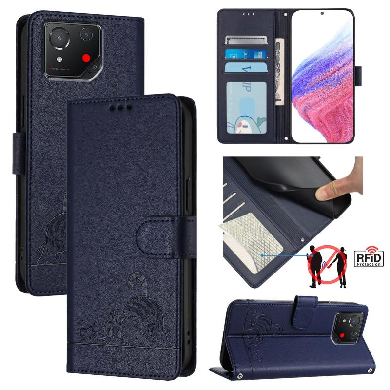 For Asus ROG Phone 8 Cat Rat Embossed Pattern RFID Leather Phone Case with Lanyard(Blue)