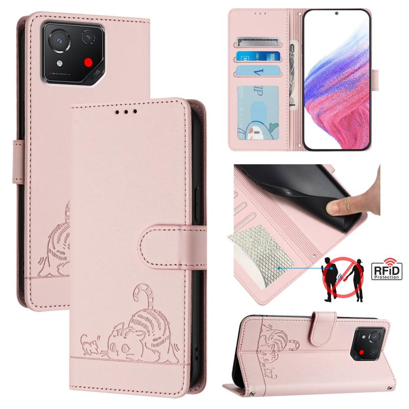 For Asus ROG Phone 8 Cat Rat Embossed Pattern RFID Leather Phone Case with Lanyard(Pink)