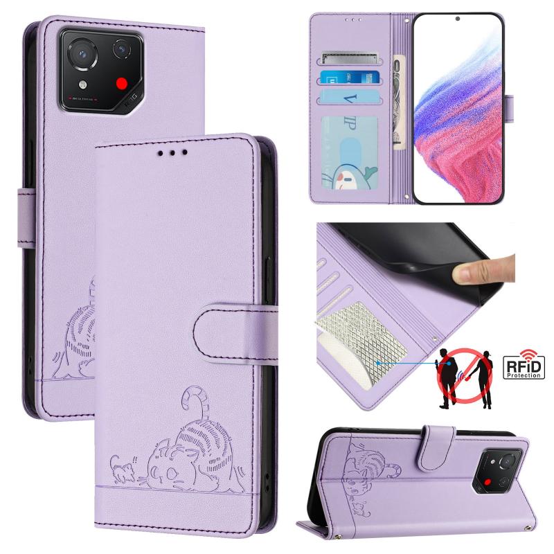 For Asus ROG Phone 8 Cat Rat Embossed Pattern RFID Leather Phone Case with Lanyard(Purple)