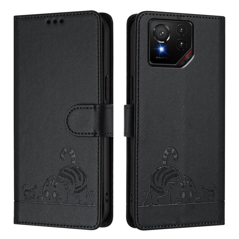 For Asus ROG Phone 9 / 9 Pro Cat Rat Embossed Pattern RFID Leather Phone Case with Lanyard(Black)