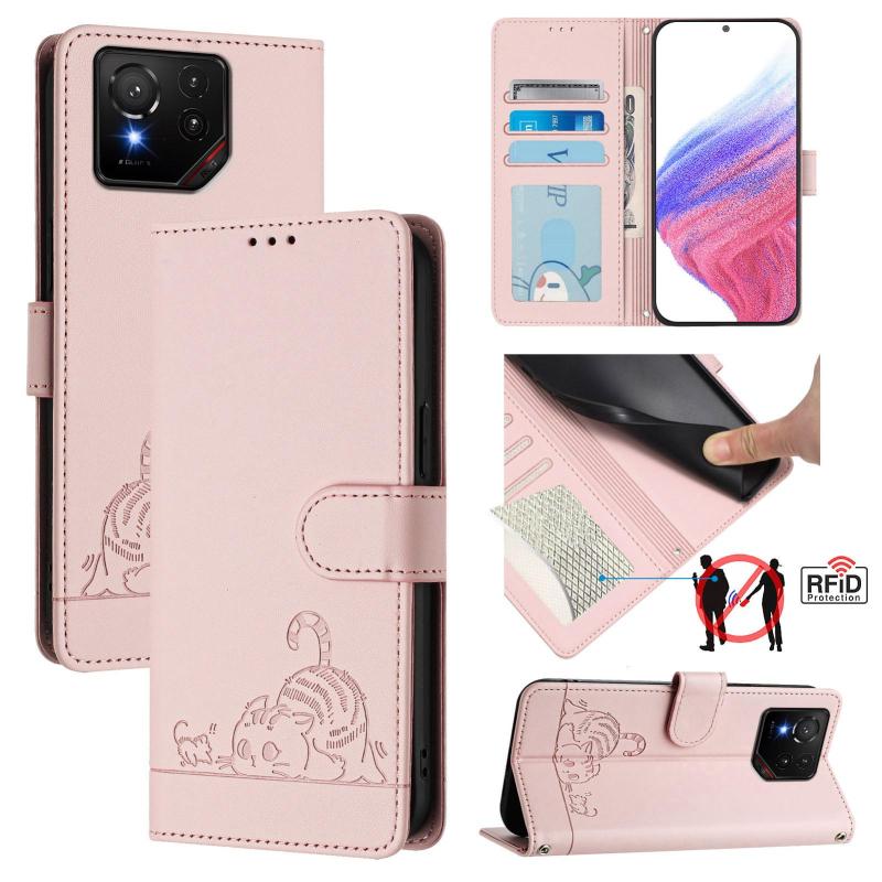 For Asus ROG Phone 9 / 9 Pro Cat Rat Embossed Pattern RFID Leather Phone Case with Lanyard(Pink)