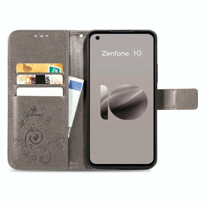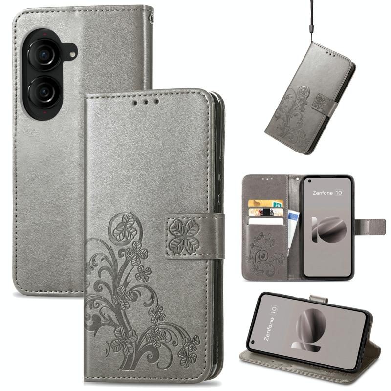 For ASUS Zenfone 10 Four-leaf Clasp Embossed Buckle Leather Phone Case(Grey)