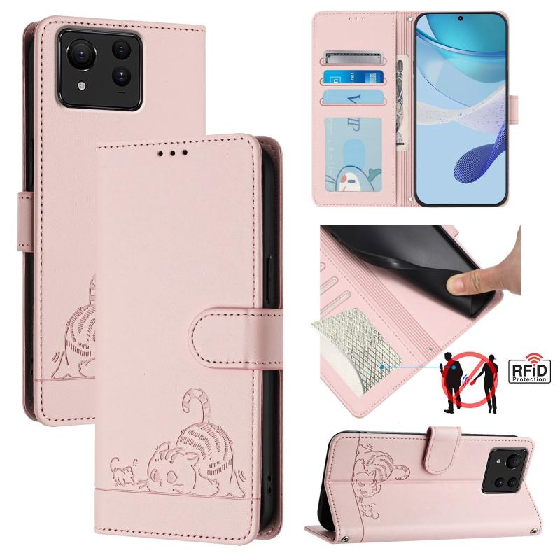 For Asus Zenfone 11 Ultra Cat Rat Embossed Pattern RFID Leather Phone Case with Lanyard(Pink)
