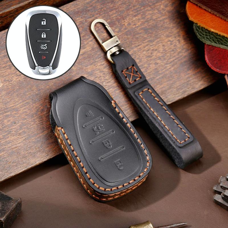 For Chevrolet 4-button Hallmo Car Cowhide Leather Key Protective Cover Key Case(Black) (Hallmo)