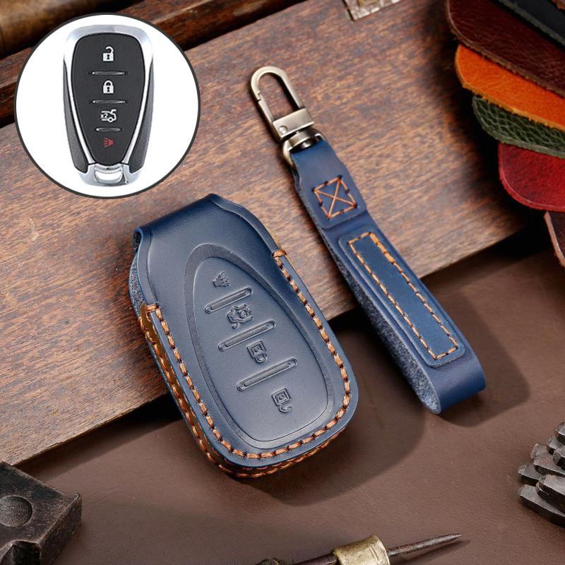 For Chevrolet 4-button Hallmo Car Cowhide Leather Key Protective Cover Key Case(Blue) (Hallmo)