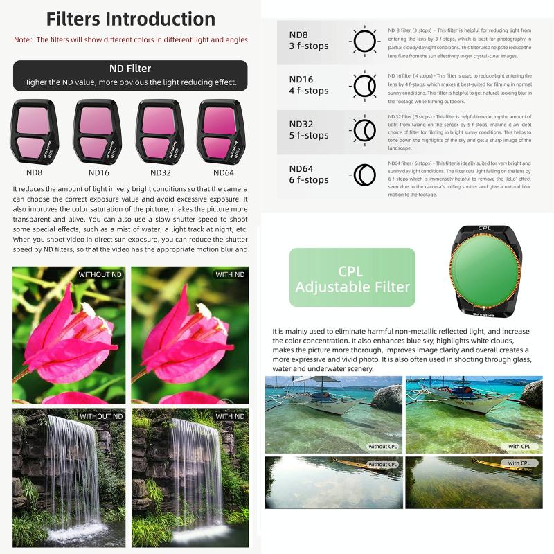 2. CPL Filters: Increases color saturation, creating deep, rich scenic images. Helps to reduce the amount of light entering the lens.