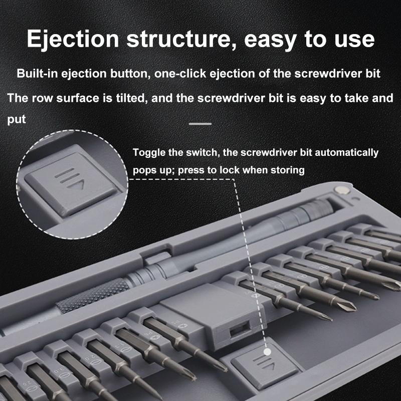 4. The storage box has a built-in ejection button, which can eject the screwdriver bits with one click, and the row surface is tilted, making it easy to take and put the screwdriver bits