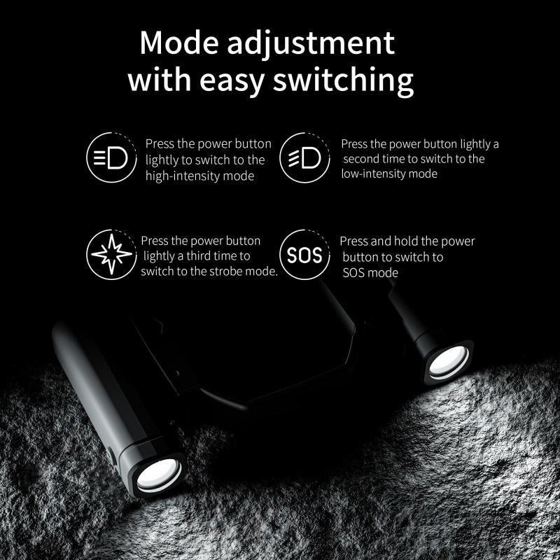 3. Three modes. Three adjustment modes, you can adjust them at will tomorrow night, and the third one is SOS mode, which can cope with outdoor emergency measures. The USB charging port can be charged at any time. It can last for two hours when fully charged, which can basically meet the needs of night flight;