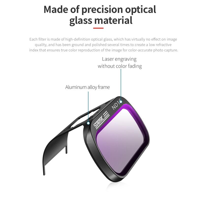 3. The metal frame is laser engraved with a matte black finish to prevent light leakage or ghosting, ensuring that each filter has been rigorously tested and will not add extra burden to your gimbal or interfere with the normal flight of the drone. The single weight is only 1 gram.