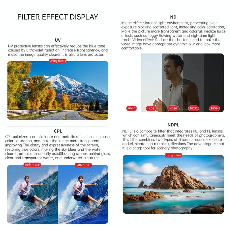 3. ND Filter: You can get more freedom to control aperture and shutter, bring more exposure methods and creative space for photography creation, and effectively prevent overexposure. The number behind ND represents the ability of the ND mirror to block light.