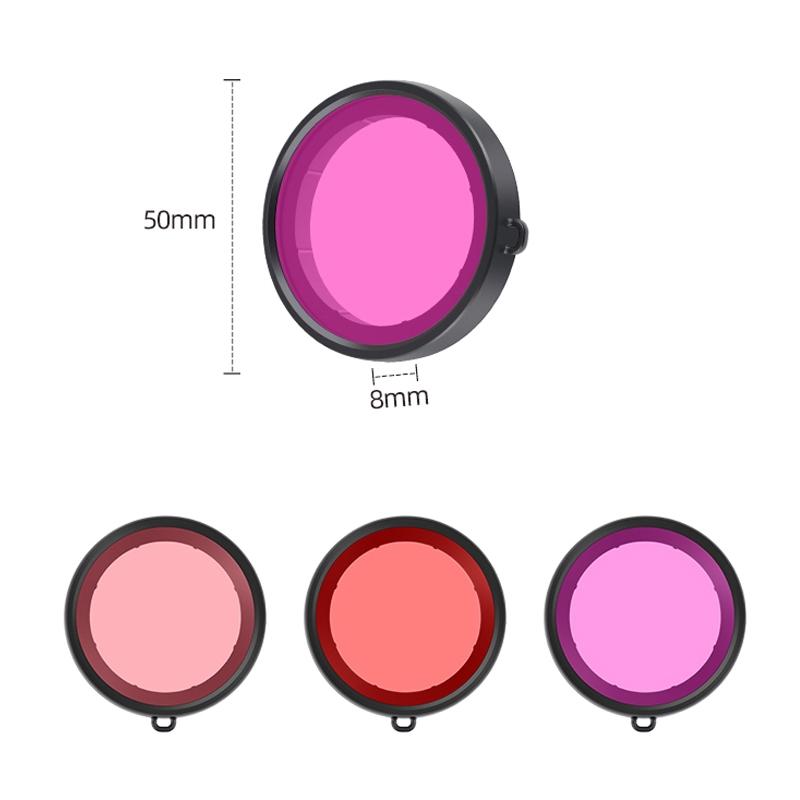 - Red filter: Red filter can be used around noon (sunlight direct water surface) in the water depth 10-20 meters, the main purpose is to reduce the red absorbed by water, effectively improve the blue phenomenon of underwater shooting, restore color balance, prevent shooting the image too blue or too green.