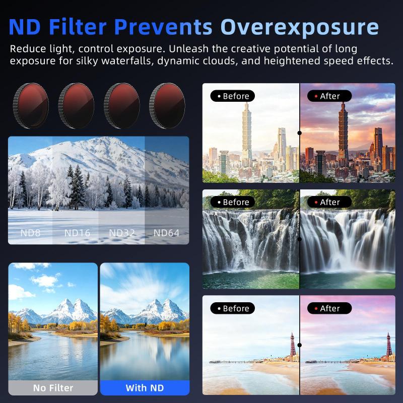 6. ND Filter: Reduces light intake to avoid overexposure, supports longer exposure time to easily capture the aesthetic sense of moving clouds and flowing waters.