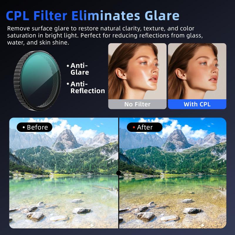 7. CPL Polarizing Filter: Can effectively eliminate surface reflections such as those on glass, water, as well as facial oil shine, restores the sharpness and natural color of objects, making the picture more transparent and delicate in texture.