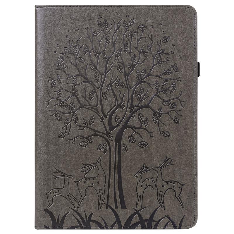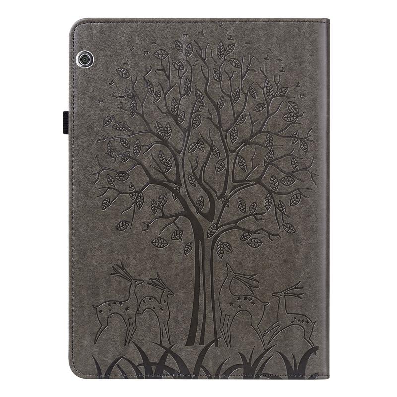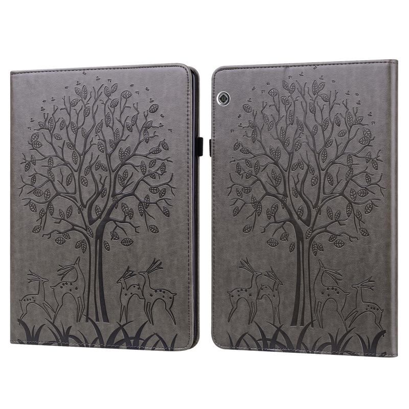 For Huawei MediaPad T5 Tree & Deer Pattern Pressed Printing Horizontal Flip PU Leather Case with Holder & Card Slots(Grey)