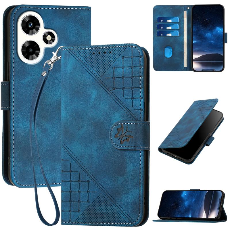 For Infinix Hot 30i Grid Butterfly Embossed Pattern Leather Phone Case with Lanyard(Dark Blue)