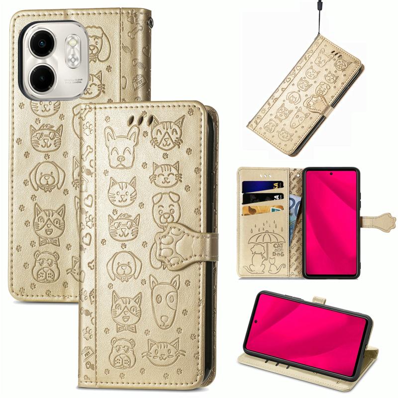 For Infinix Smart 9 Cat and Dog Embossed Leather Phone Case(Gold)