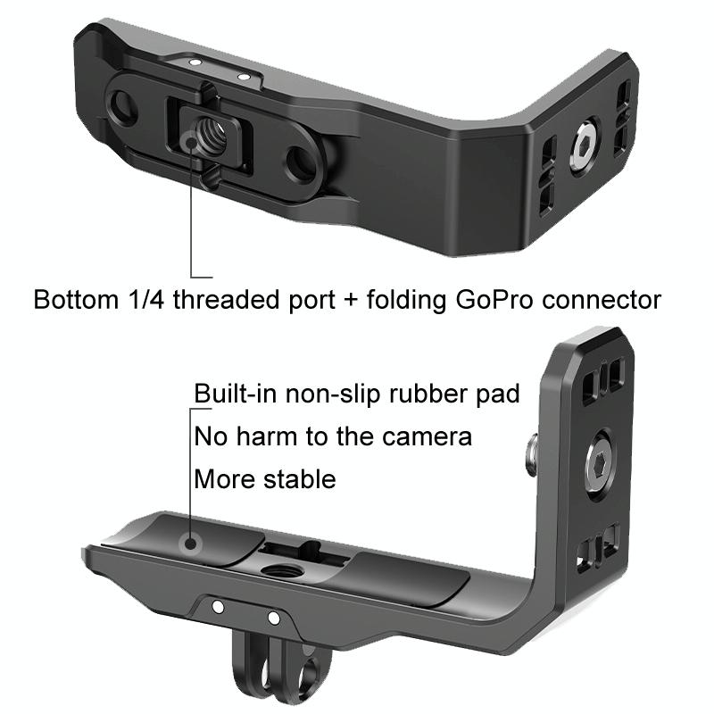 1. Variable interface, bottom 1/4 threaded port + folding GoPro interface 2 in 1, adapt to more accessories