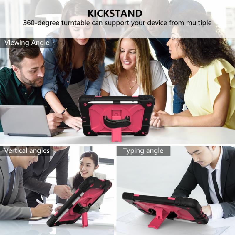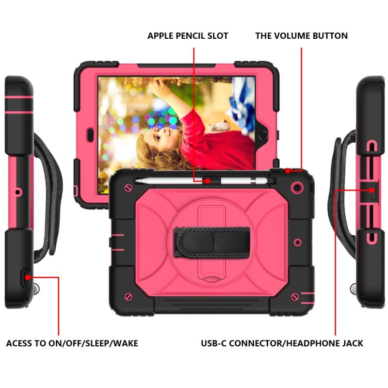 For iPad 10.2 Shockproof PC + Silicone Combination Case with Holder & Hand Strap & Shoulder Strap(Black + Rose Red)
