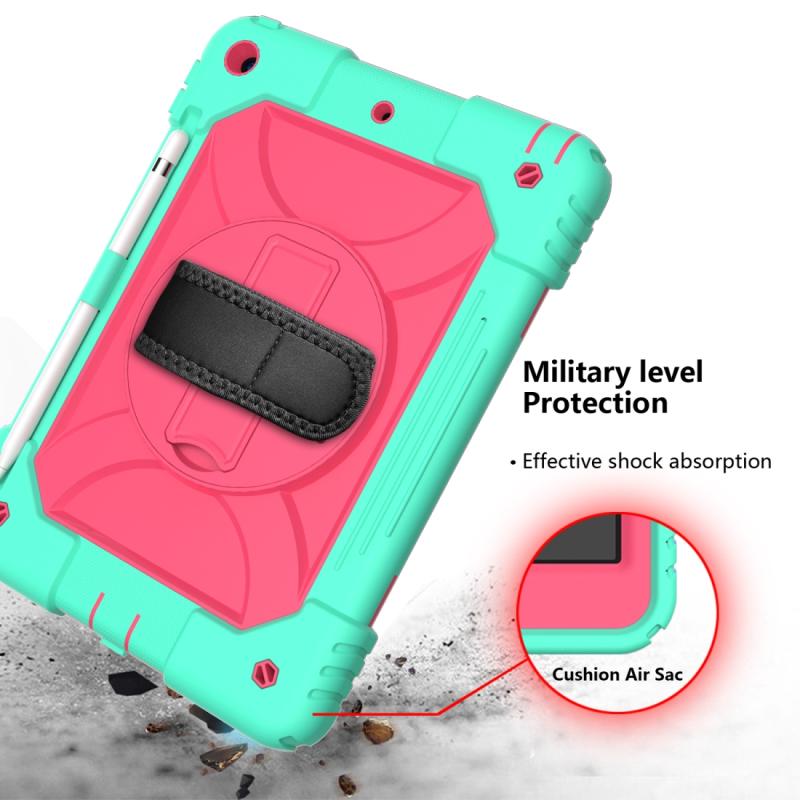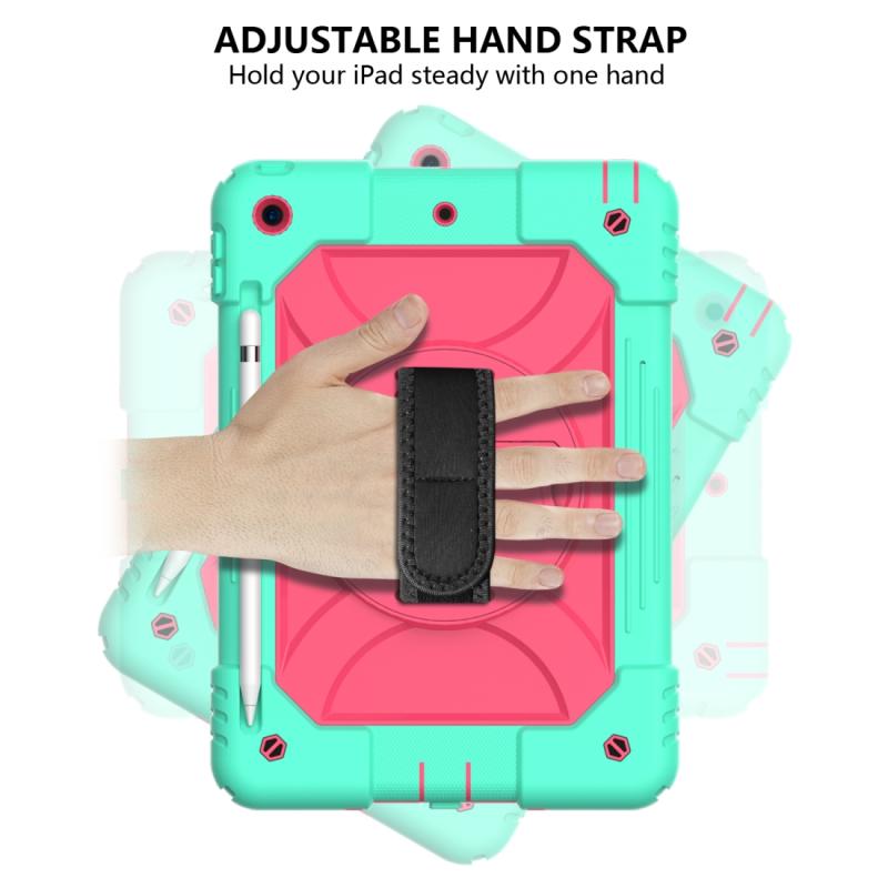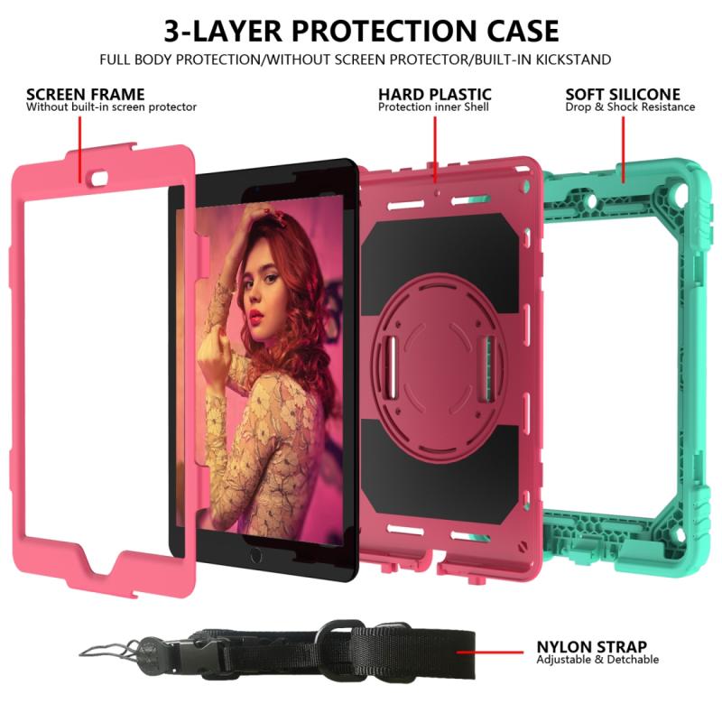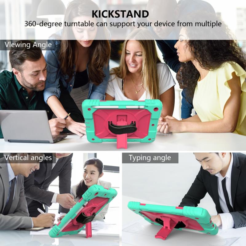 For iPad 10.2 Shockproof PC + Silicone Combination Case with Holder & Hand Strap & Shoulder Strap(Mint Green + Rose Red)