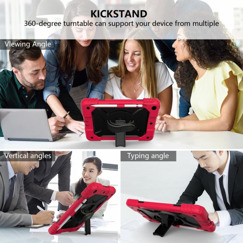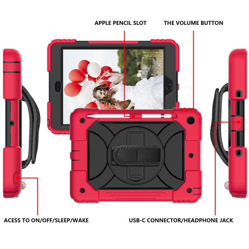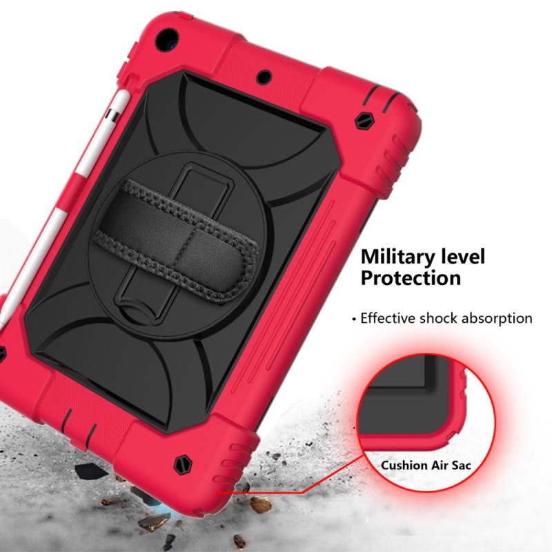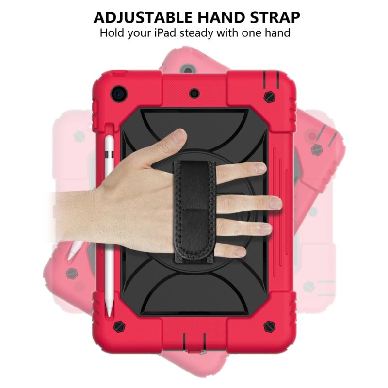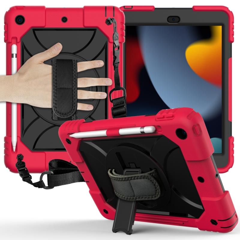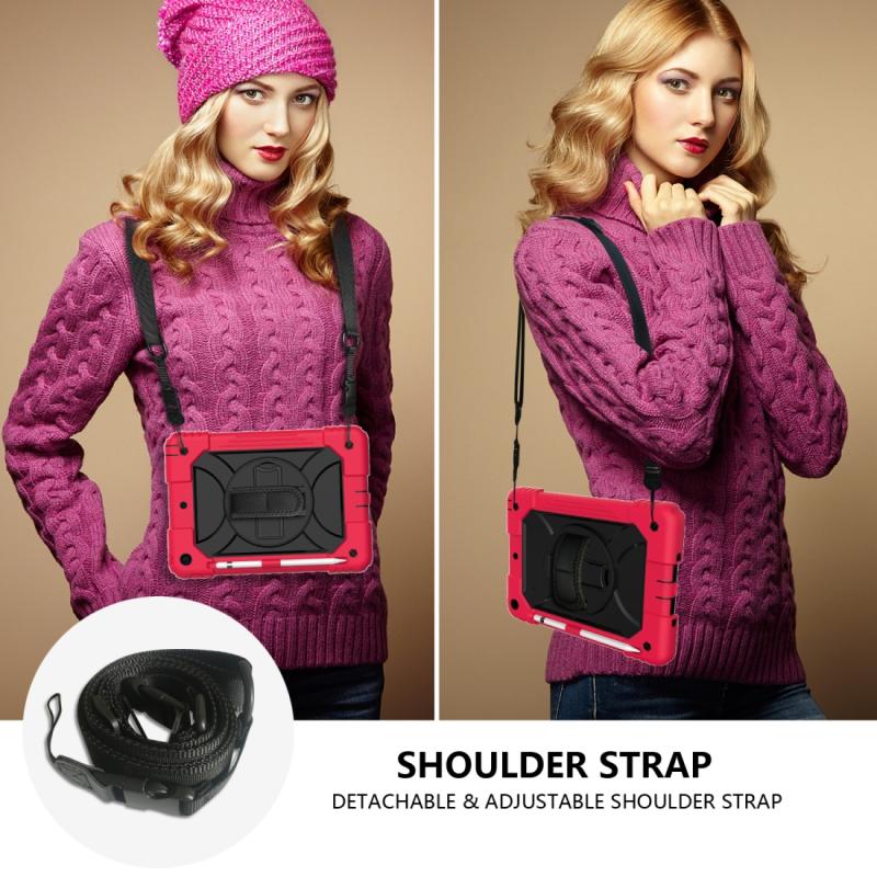 For iPad 10.2 Shockproof PC + Silicone Combination Case with Holder & Hand Strap & Shoulder Strap(Red+Black)