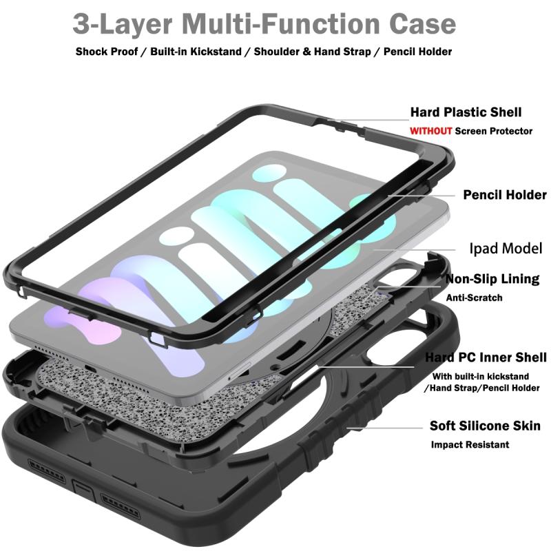 For iPad mini 6 / mini 2024 X Rotation PC Hybrid Silicone Tablet Case with Strap(Full Black)