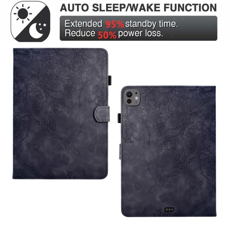 For iPad Pro 11 2024 Flowers and Bird Embossed Smart Leather Tablet Case(Black)