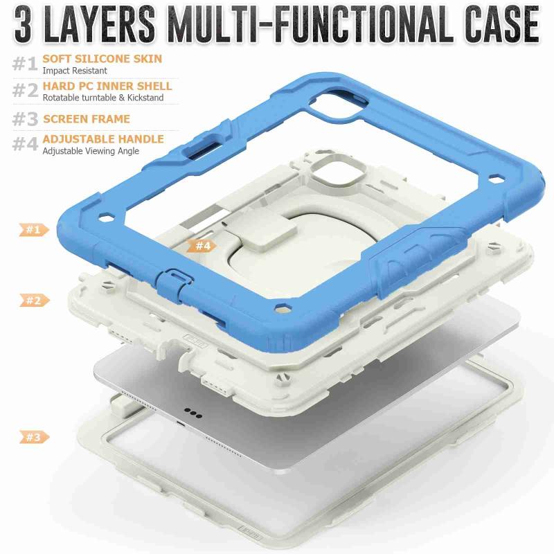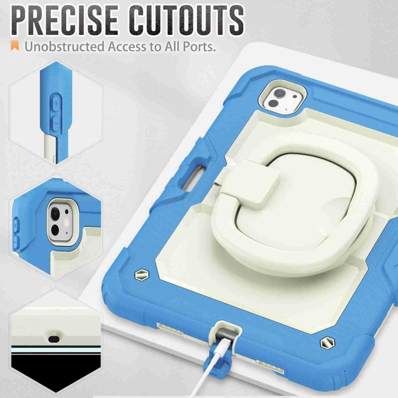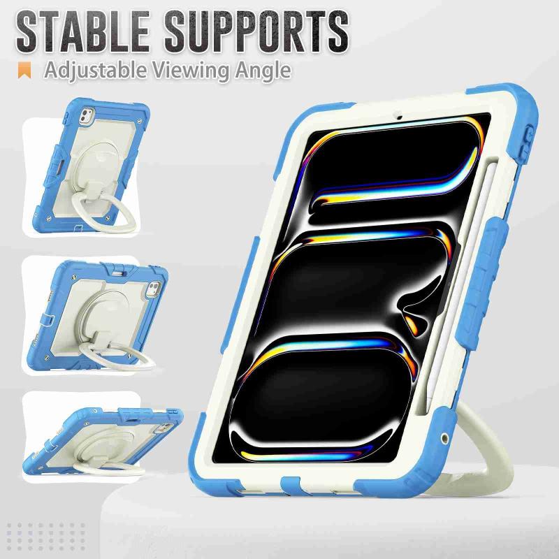 For iPad Pro 11 2024 Handle Silicone Hydric PC Tablet Case with Shoulder Strap(Beige Cyan-blue)