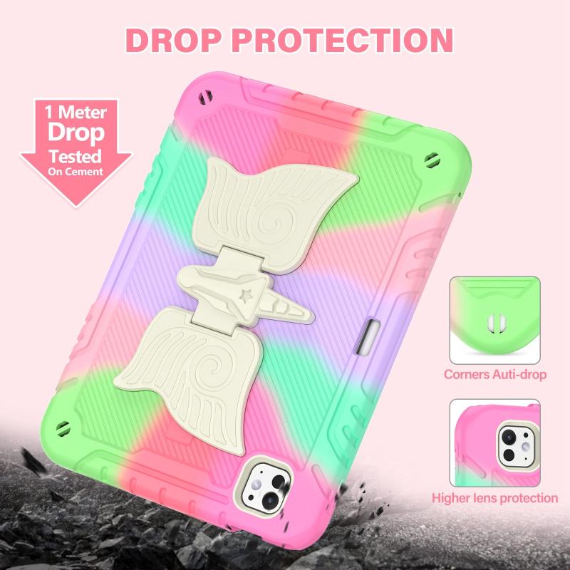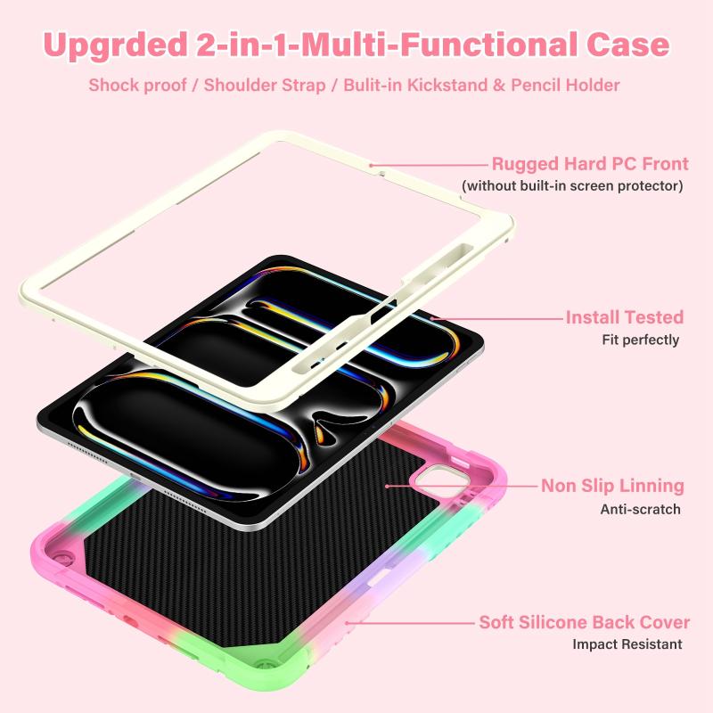 For iPad Pro 11 2024 Kickstand PC Hybrid Silicone Tablet Case with Strap(Colorful Rose Red)