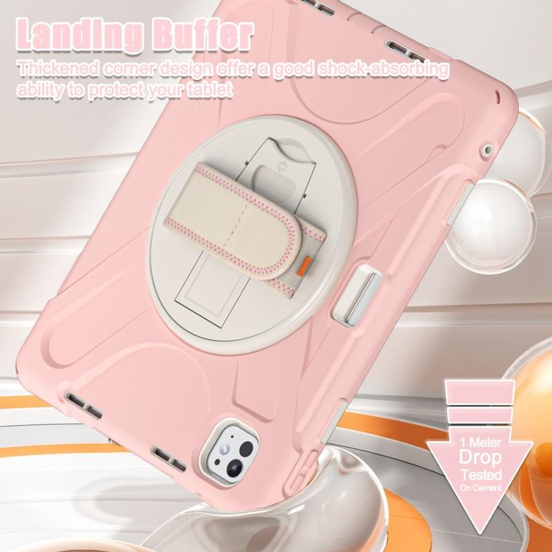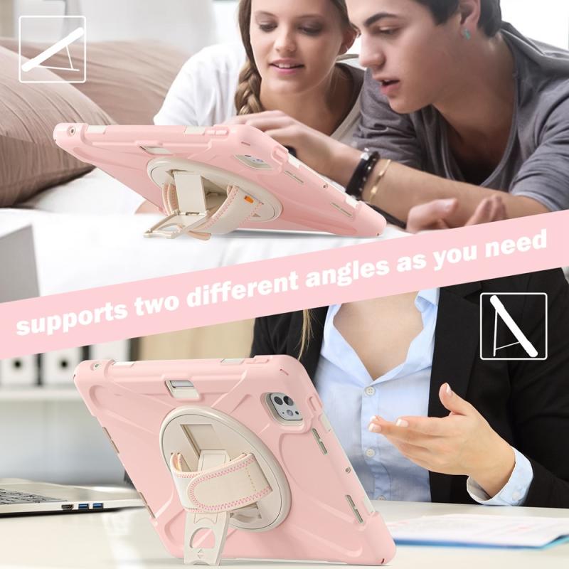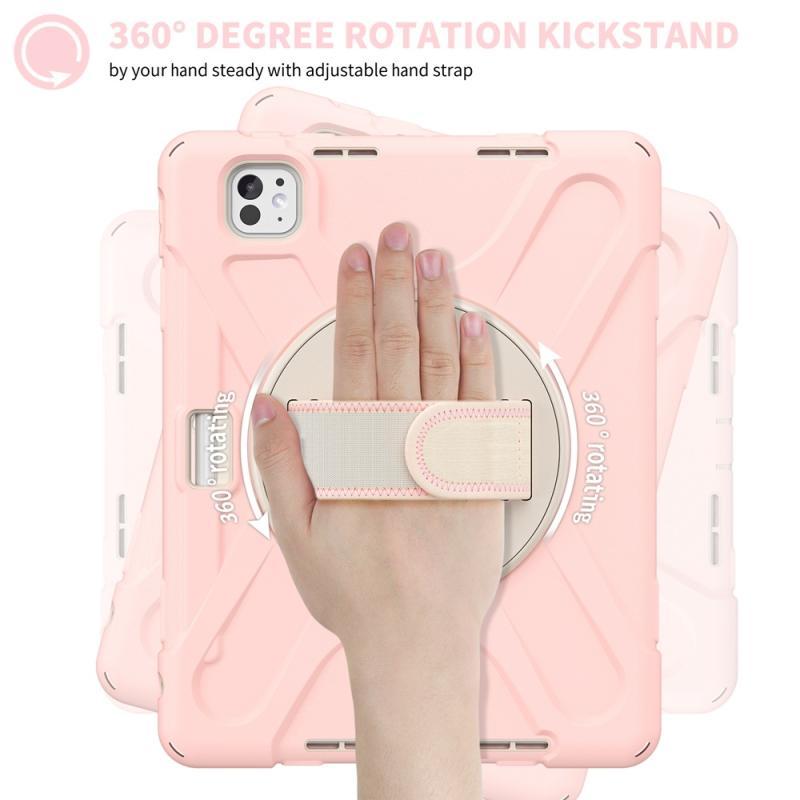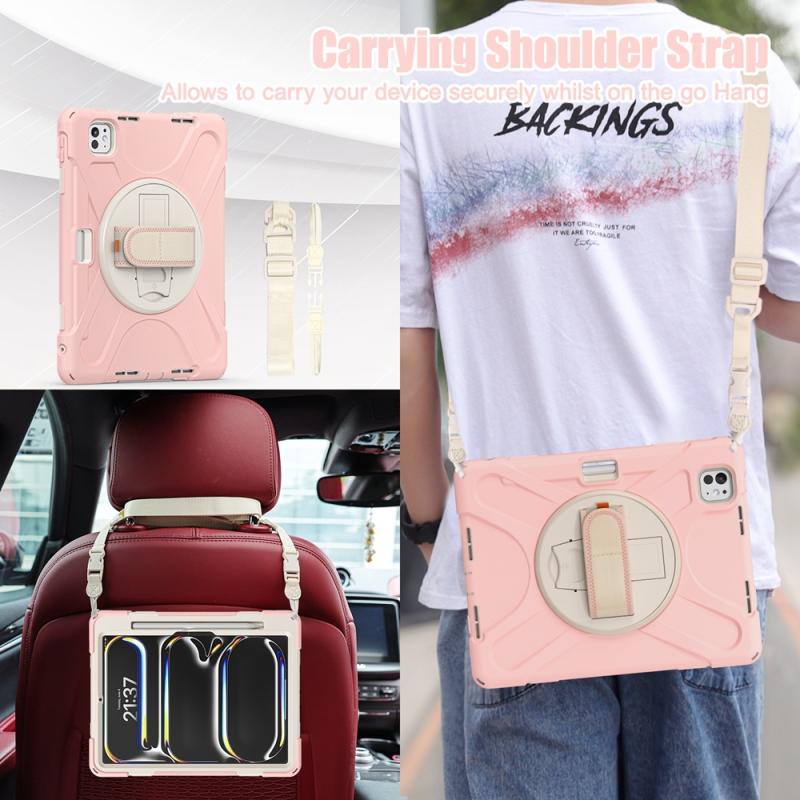 For iPad Pro 11 2024 Rotatable Holder Silicone Hybrid PC Tablet Case with Shoulder Strap(Cherry Blossom Pink)