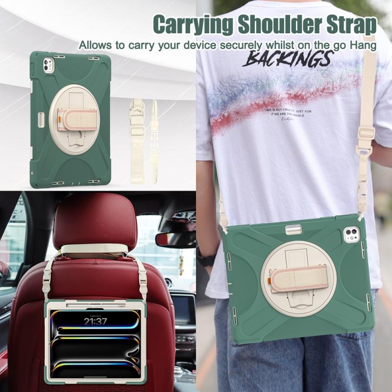 For iPad Pro 13 2024 Rotatable Holder Silicone Hybrid PC Tablet Case with Shoulder Strap(Emreald Green)