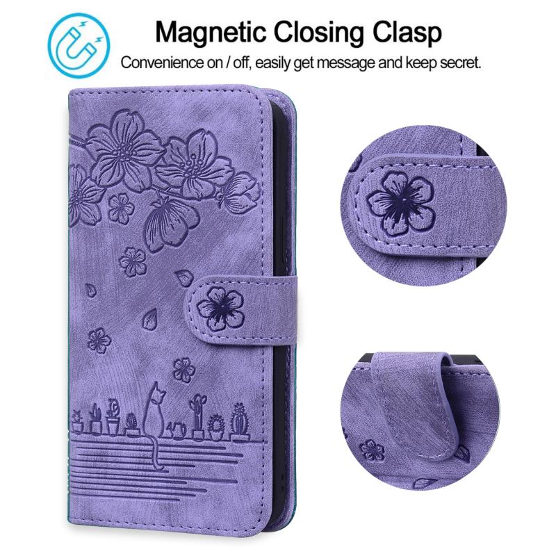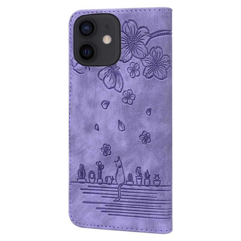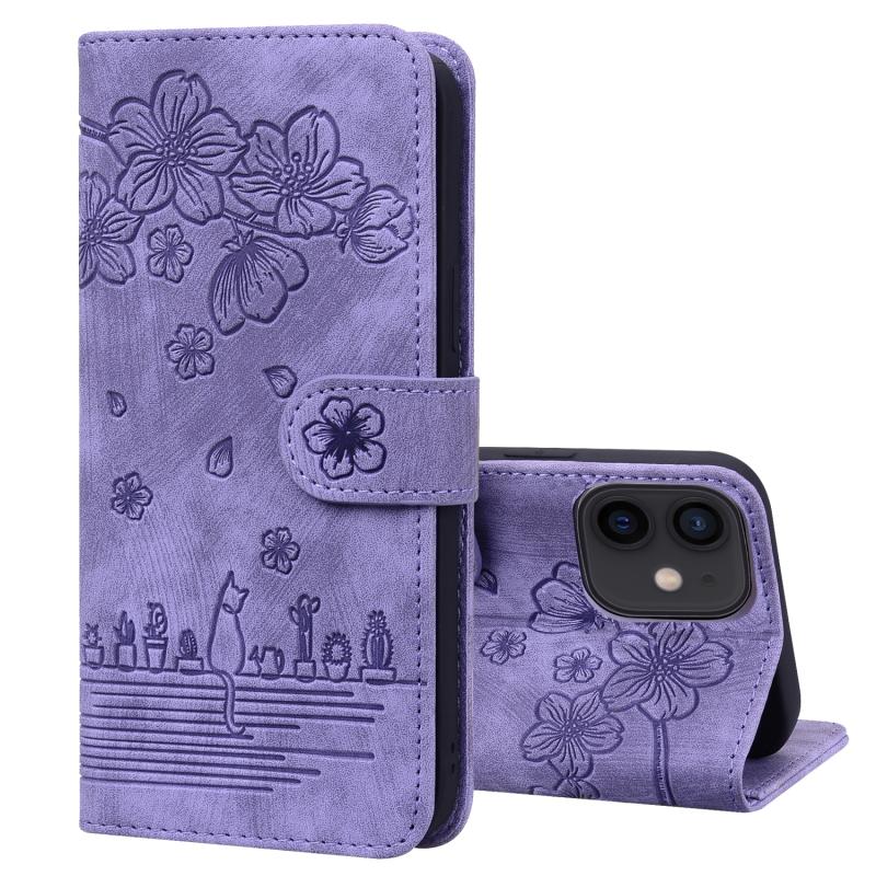 For iPhone 11 Cartoon Sakura Cat Embossed Leather Case (Purple)